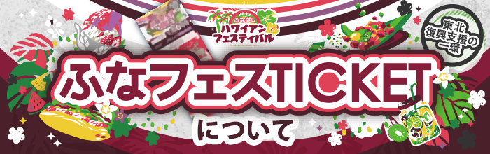 - 『ふなフェスチケット』はイベント当日、チケット1枚につき、親水公園メイン会場の各対象店舗で『ハワイアンの特別メニューor限定雑貨1つ購入』もしくは『700円の金券』として使用可能です。